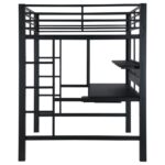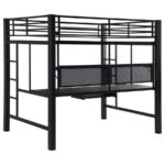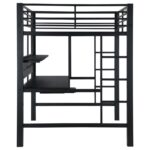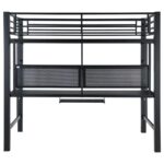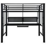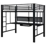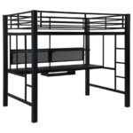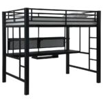 | • Save space with a full workstation loft bed finished in black • Workstation features spacious full – Length desktop, keyboard tray, and storage shelves • Full length guardrails and ladder on either side included • Constructed with steel, MDF, and laminate • Slat kit included |