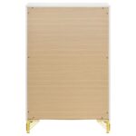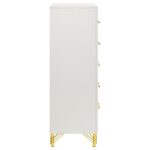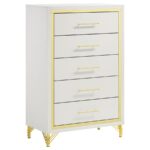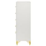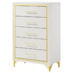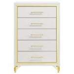 Inspired vintage touches create a refined sensibility for a modern five-drawer chest. Its tall, compact profile is ideal for a dressing area, offering plenty of storage with five roomy drawers that host everything from clothing and accessories to linens and other personal effects. The chest shows off a bright white finish, complete with gleaming gold trim that adds warmth and elegance. Its long bar drawer pulls add character, while hair pin inspired legs bring retro glamour and sophistication. Add decor to the top for a personal touch in your bedroom.