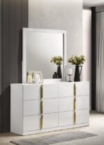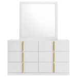 | Sleek and symmetrical, this six-drawer dresser with mirror offers bold style inspired by Italian contemporary design. The white high gloss finish is crafted from eco-friendly PET thermoplastic, offering exceptional scratch resistance, moisture protection, and long-term durability. Vertically mounted polished gold pulls create striking contrast, while the framed mirror completes the look with clean lines and reflective clarity. | ||