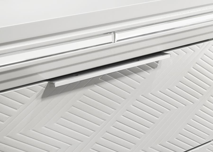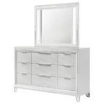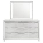 | • Dresser and mirror set with modern Italian design • Striking white finish with mirror framing and polished chrome metal hardware • Dresser with nine drawers, picture framed recessed panels, and embossed herringbone graphic patterns • Mirror with touch LED light for added sophistication • Crafted from rubberwood, MDF, and mirror |