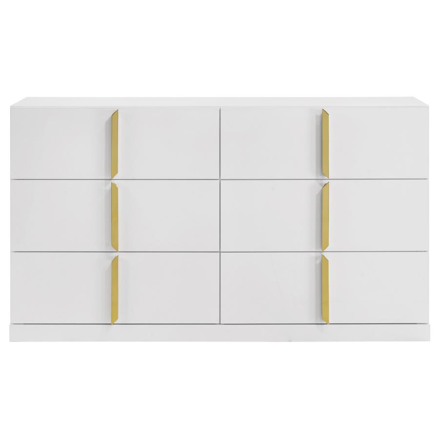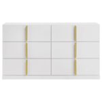 | Clean and structured, this six-drawer dresser draws from Italian contemporary style to deliver bold presence and refined function. Finished in white high gloss PET thermoplastic, it offers a scratch-resistant, moisture-resistant surface that is both durable and eco-friendly. Vertically mounted polished gold pulls create a sculptural centerline across six smooth-gliding drawers, combining sleek storage with standout design. | ||