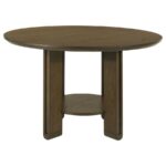 | • Dining set includes a round table with a rich brown finish and matching upholstered chairs • Table features angular legs and an open lower shelf for added storage and style • Chairs upholstered in light tan fabric with foam-padded seats for enhanced comfort • Wrapped backrests with unique brown tie accents add a sophisticated, stylish detail • Constructed from rubberwood, engineered wood, and fabric for lasting durability • Perfect for transitional or modern dining spaces with a warm, refined aesthetic | ||