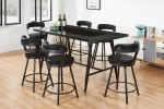 Black wood and metal pub dining set with 6 pub swivel chairs. Wooden tabletop with center table top glass, metal legs, and 4 wine bottle holders. Pub swivel chairs with black cushion and metal legs